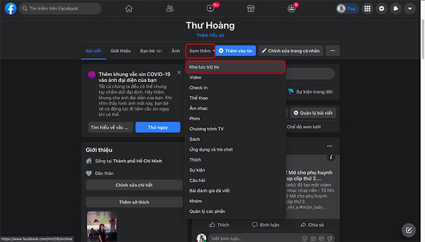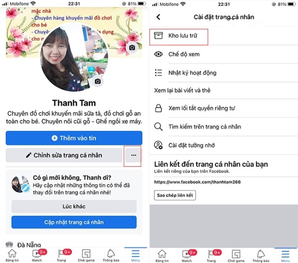 Bước 1: Trước tiên bạn cũng cần truy cập vào trang cá nhân của mình, sau đó nhấn Xem thêm và chọn mục Kho lưu trữ.