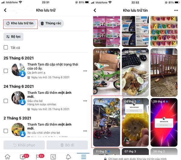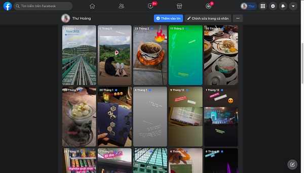 Bước 2: Sau khi bạn đã chọn mục Kho lưu trữ tin thì ngay sau đó toàn bộ các story Facebook cũ sẽ hiển thị trên màn hình.
