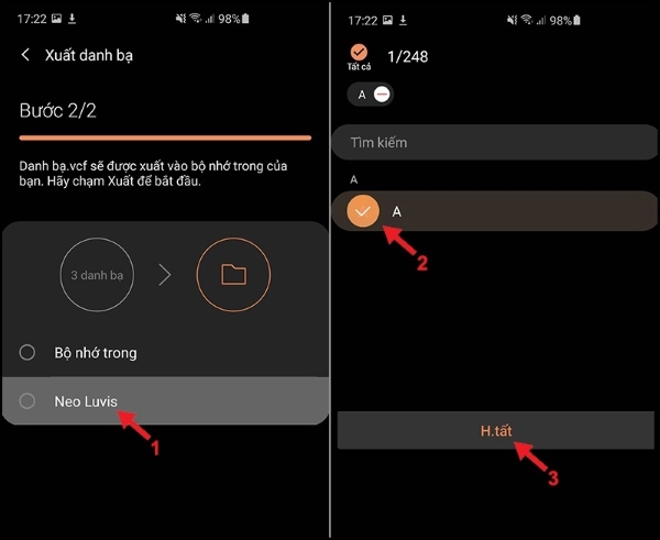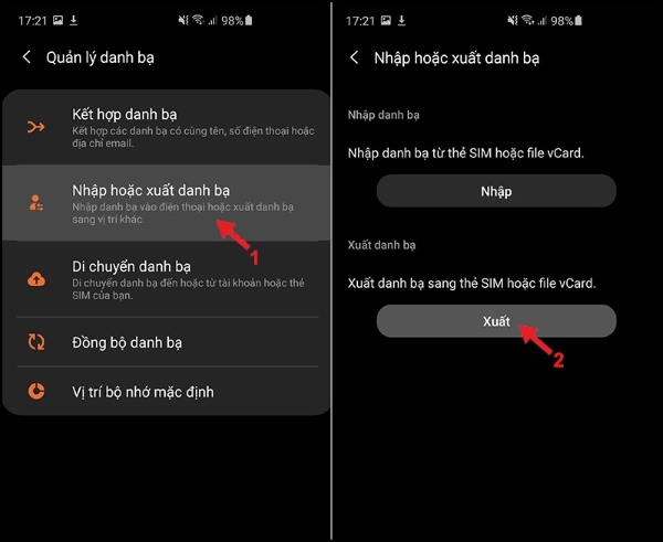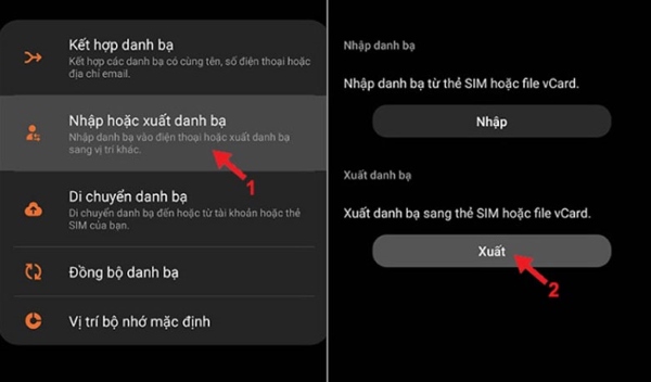 Bước 4: Chọn Nhập hoặc Xuất danh bạ rồi chọn nút Xuất > chọn thẻ SIM rồi chọn số điện thoại cần xuất và nhấn Hoàn tất. Thao tác cuối cùng bạn chọn Xuất > rồi nhấn OK để hoàn tất chuyển danh bạ sang thẻ sim.