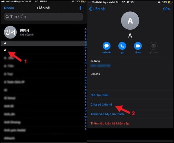 - Bạn chọn số điện thoại của một người bạn muốn lưu vào sim, sau đó nhấn Chia sẻ liên hệ.