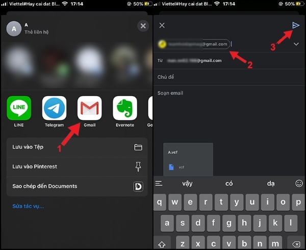 - Trong mục chia sẻ liên hệ bạn chọn Gmail. Sau đó, bạn nhập địa chỉ Gmail, đây có thể là một tài khoản trên chiếc điện thoại Android bạn đã chuẩn bị và nhấn Gửi.
