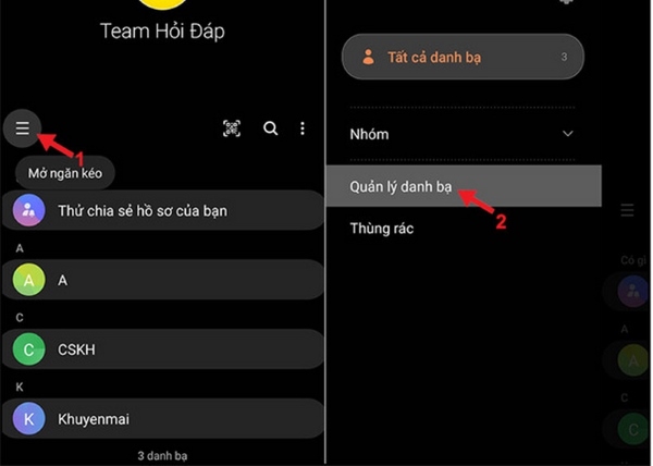- Bạn mở ứng dụng Danh bạ từ màn hình chính > nhấn nút 3 gạch, sau đó kích chọn Quản lý Danh bạ.