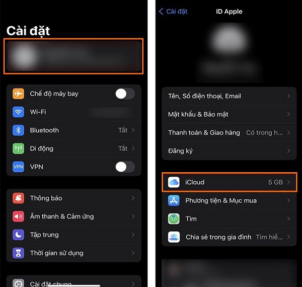 Bước 1: Truy cập vào Cài đặt/ Chọn ID Apple/ Chọn iCloud.