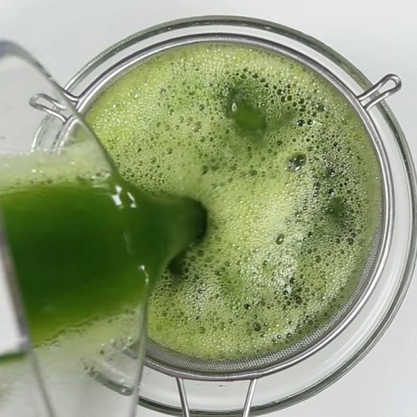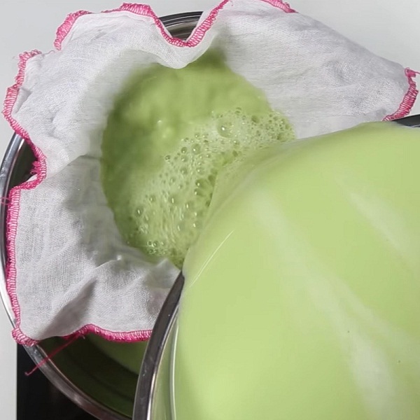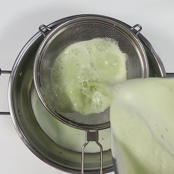 – Bạn đổ hỗn hợp vừa xay qua rây để lọc lấy nước cốt lá dứa.