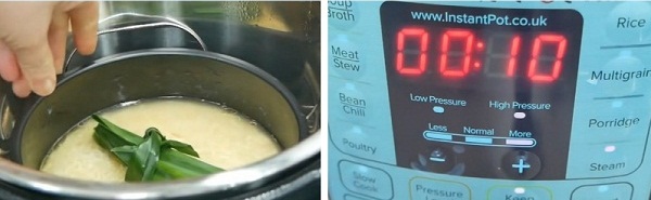 – Cho vỉ hấp vào nồi áp suất, thêm nước vào rồi đặt nồi nếp vừa trộn vào, đậy nắp và chỉnh sang chế độ Steam. Đến khi nồi chuyển sang chế độ More thì để nóng và bật hẹn giờ 10 phút.