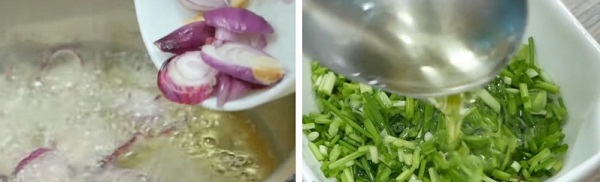 – Bắc nồi lên bếp, cho dầu vào và đun ở lửa vừa đến khi dầu sôi rồi cho hành tím vào đảo đều sao cho hành vàng, thơm thì vớt ra đĩa. Sau đó, cho 2 muỗng canh dầu nóng vào chén đựng hành lá để làm mỡ hành.
