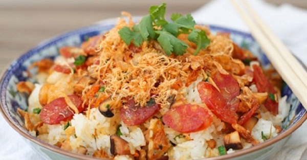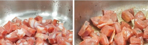 Lạp xưởng bạn cắt thành hình hạt lựu vừa ăn. Tiếp theo, bắc nồi lên bếp và cho thêm một ít nước rồi cho lạp xưởng vào, đảo đều đến khi lạp xưởng chín vàng rồi cho ra chén.