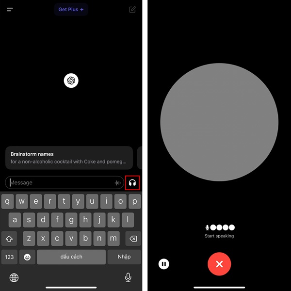 Sau đó, hãy đăng nhập vào ChatGPT, tại giao diện trò chuyện, bạn hãy nhấn vào biểu tượng tai nghe để có thể trò chuyện với ứng dụng bằng giọng nói. Hệ thống sẽ tự động phân tích giọng nói của bản và phản hồi lại ngay.
