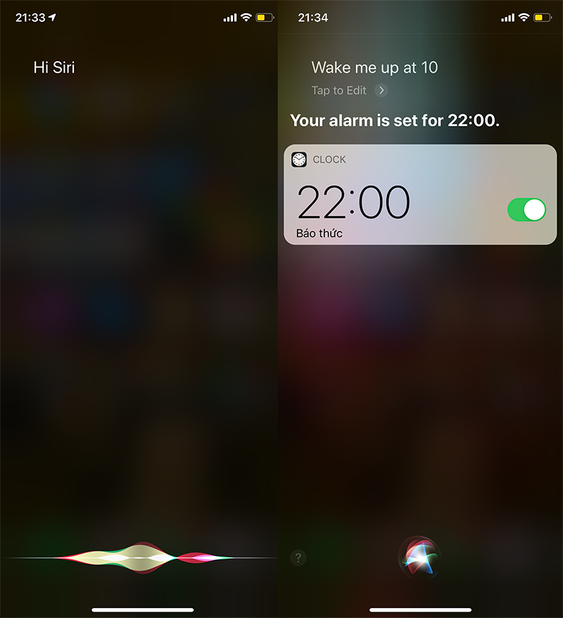 Cài đặt báo thức: Người dùng chỉ cần ra lệnh “Hey Siri, wake me up at 10 AM “, khi đó Siri sẽ đánh thức bạn đúng giờ. Nếu bạn muốn điều chỉnh thời gian khác sau khi đã đặt, bạn chỉ cần nhắc lại cho Siri và thời gian sẽ thay đổi.