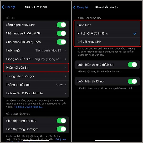 Luôn Luôn: Ngay cả khi bạn bật chế độ im lặng thì Siri sẽ luôn trả lời bạn và hiển thị phản hồi.