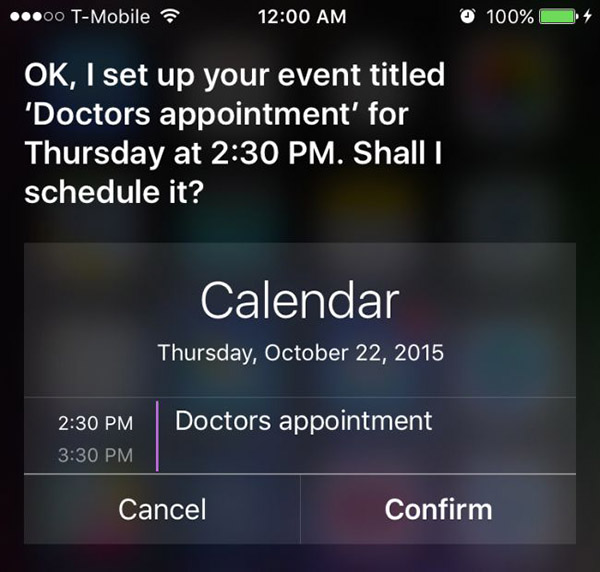Tạo các sự kiện: Người dùng chỉ việc hướng dẫn Siri để lập một sự kiện, chỉ định rõ tên, ngày và thời gian bạn muốn tạo. Dựa vào những thông tin vừa được hướng dẫn này, Siri sẽ tiến hành ghi chú vào lịch trên iPhone của bạn.