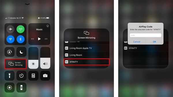 Để phản chiếu màn hình iPhone lên Tivi, đầu tiên bạn truy cập vào Control Center (Trung tâm điều khiển) của iPhone bằng cách gạt màn hình từ trên xuống. Sau đó, nhấn chọn vào tính năng Screen Mirroring (Phản chiếu màn hình).