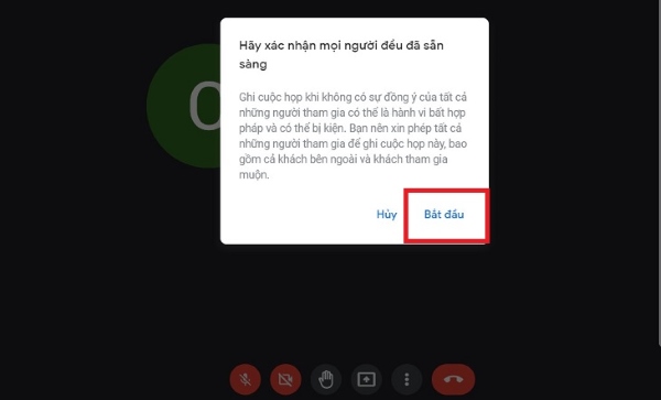 Bước 5: Sau đó, bạn hãy thông báo cho các thành viên khác về việc sẽ bắt đầu ghi màn hình. Sau khi tất cả thành viên trong cuộc họp đã sẵn sàng và đồng ý, bạn chọn “Bắt đầu”.