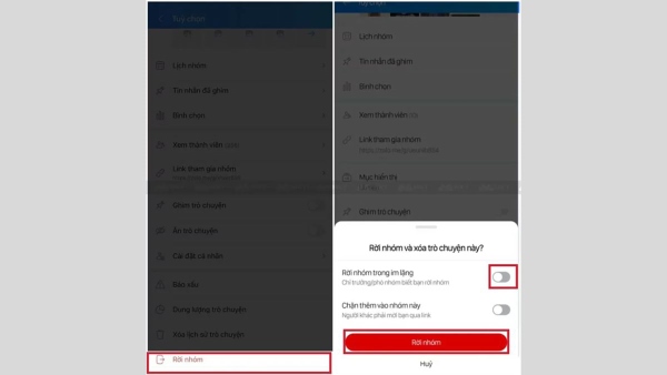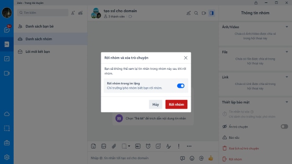Bước 4: Zalo sẽ hiển thị ra cửa sổ thông báo pop-up “Rời nhóm và xóa trò chuyện” > bạn gạt tiếp nút “Rời nhóm trong im lặng”. Như vậy là bạn đã vừa hoàn thành thoát nhóm zalo trong im lặng không có thông báo cho các thành viên trong nhóm.