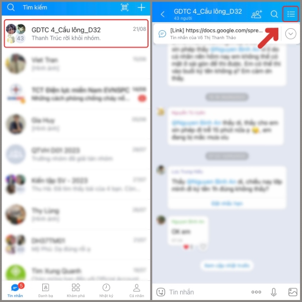Bước 1: Trước tiên người dùng cần đảm bảo mình đã cài đặt hoặc cập nhật phiên bản ứng dụng Zalo mới nhất trên điện thoại. Sau đó, bạn tìm và đi đến nhóm Zalo muốn rời khỏi. Tiếp theo, tại giao diện nhóm chat, bạn nhấn chọn vào biểu tượng dấu 3 gạch ngang tại góc phải màn hình.