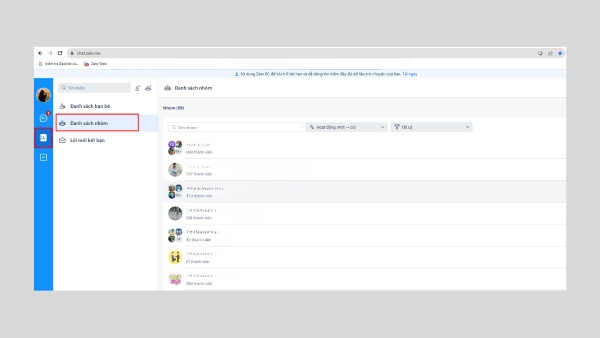 Bước 2: Tại giao diện Zalo web, bạn nhấn chọn vào biểu tượng Danh bạ phía bên trái màn hình và chọn Danh sách nhóm để tìm nhóm Zalo mà bạn đã tham gia.