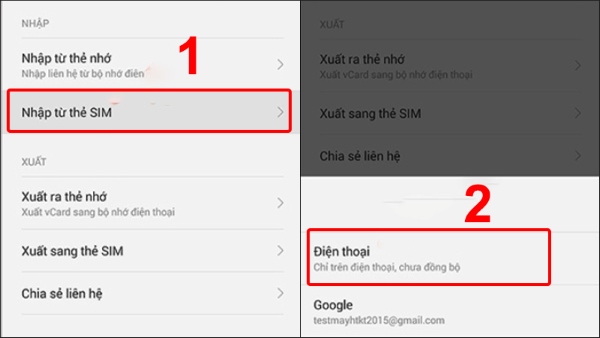 Bước 2: Chọn mục Nhập từ thẻ SIM > chọn vị trí lưu Điện thoại.