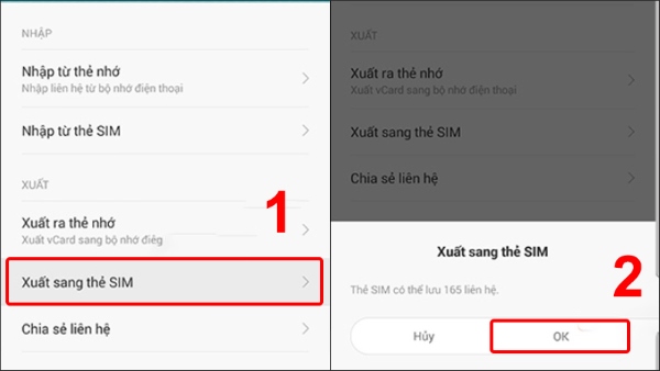 Bước 3: Chọn tiếp Xuất sang thẻ SIM > chọn OK nếu để sao chép danh bạ từ điện thoại sang SIM.