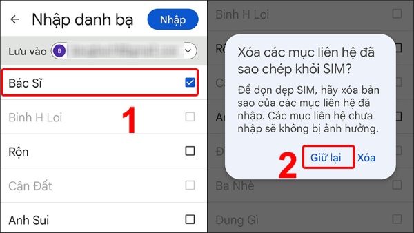 Trường hợp nếu bạn chỉ muốn sao chép 1 hoặc một số liên hệ nhất định thì hãy nhấn bỏ chọn các số liên hệ còn lại > chọn Lưu vào Gmail hoặc tài khoản Mi > chọn Nhập > nhấn vào cửa sổ hiển thị pop-up thông báo giữ lại hoặc xóa các liên hệ trong SIM > chọn Giữ lại.