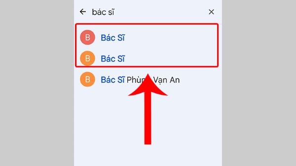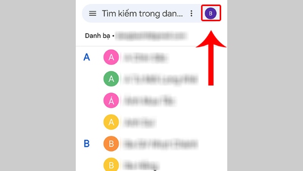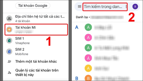 Bước 2: Chọn vào tài khoản Gmail hoặc tài khoản Mi đã lưu ở bước trên > tiến hành nhập tên danh bạ cần tìm tại ô tìm kiếm.