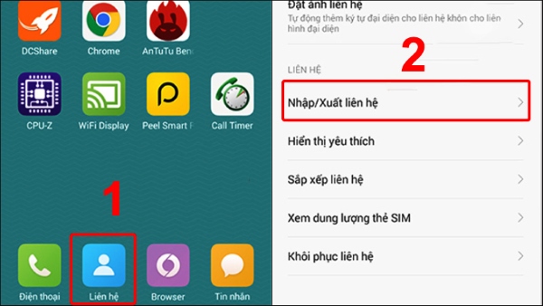 Bước 1: Nhấn vào Liên hệ > chọn mục Nhập/Xuất liên hệ.