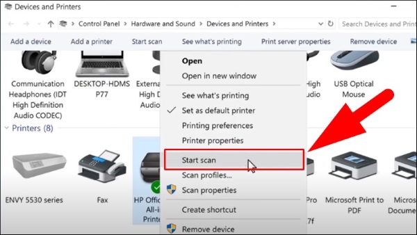 Bước 4: Tại mục Printers, bạn chọn máy in > nhấn chuột phải chọn Start Scan.