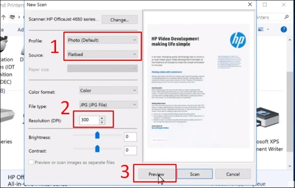 Bước 5: Chọn định dạng tài liệu Scan > chọn độ phân giải (Resolution) > chọn Preview để xem trước và tiến hành scan tài liệu.