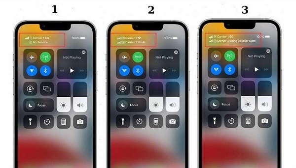 - Hình 3: SIM 1 sử dụng 5G và SIM 2 sử dụng dữ liệu di động từ SIM 1 và có thể sử dụng tính năng gọi qua Wifi.