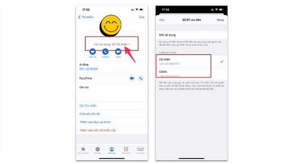Muốn thiết lập danh bạ với SIM tương ứng trên iPhone bạn chỉ cần mở Danh bạn/ Liên hệ mà bạn muốn thiết lập/ Chọn số điện thoại ưa thích hoặc số ưu tiên been dưới tên danh bạ.