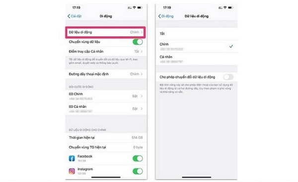 Bước 1: Chọn SIM sử dụng mạng di động bằng cách vào Cài đặt/ Mạng đi động/ Dữ liệu di động. Sau đó bạn chỉ cần chọn SIM mà bạn muốn dùng dữ liệu di động.