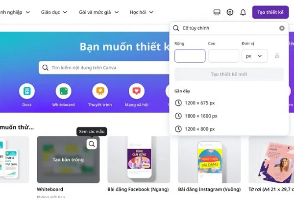Bước 1: Bạn nhấn vào Tạo thiết kế, sau đó chọn kích thước ảnh phù hợp.