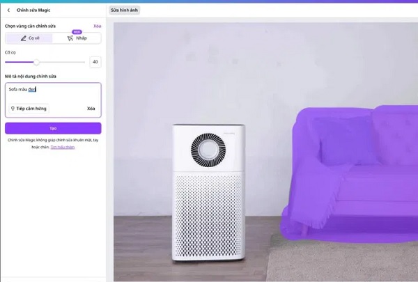 Bước 4: Tiếp đến bạn vào Chọn vùng cần chỉnh sửa, sau đó chọn kích thước Cọ vẽ và tiến hành tô lên vùng muốn thay đổi trong ảnh. Tiếp đến bạn nhập nội dung cần chỉnh sử và click vào nút Tạo để Canva AI tiến hành quá trình chỉnh sửa ảnh.