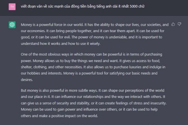 Không chỉ những đáp án ngắn, Chat GPT cũng có thể được ứng dụng để viết các đoạn văn dài như một bài quảng cáo, một bài thơ, một bài văn,… Tuy vậy, cách viết của công cụ này vẫn chưa thực sự mượt mà, chỉnh chu cho lắm.
