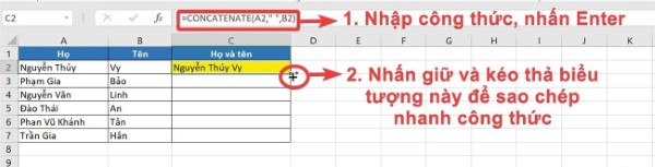 Công thức này giúp bạn ghép cột “Họ” (A2) và “Tên” (B2) thành một ô duy nhất. Sau đó, chỉ cần kéo thả công thức xuống để áp dụng cho toàn bộ danh sách.