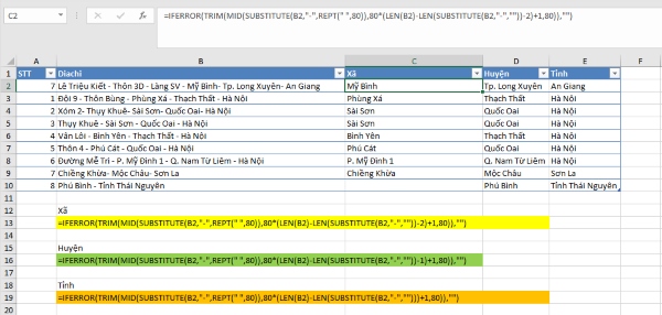 Hàm SUBSTITUTE có thể được sử dụng để thay thế các ký tự phân cách và sau đó sử dụng các hàm khác như LEFT, RIGHT, hoặc MID để tách các phần địa chỉ cụ thể.