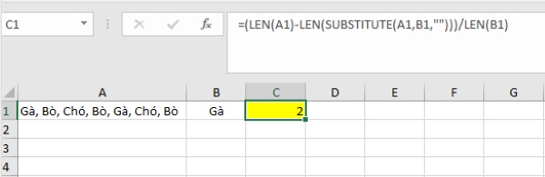 Ví dụ, để đếm số lần các từ như Bò, Gà, Chó xuất hiện trong một ô, bạn có thể sử dụng hàm SUBSTITUTE để thay thế từ cần đếm bằng chuỗi trống và sau đó tính toán sự chênh lệch độ dài để xác định số lần xuất hiện của từ đó.