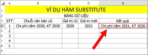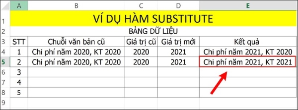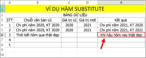 Ví dụ 3: Sử dụng hàm SUBSTITUTE để thay thế đoạn văn bản cũ bằng đoạn văn bản mới trong bảng dữ liệu minh họa.