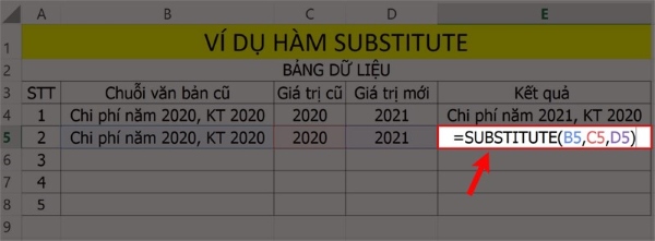 Bước 1: Trong bảng dữ liệu Excel, nhập công thức =SUBSTITUTE(B5, C5, D5) vào ô tham chiếu muốn hiển thị kết quả.