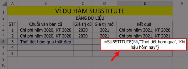 Bước 1: Trong bảng dữ liệu Excel, nhập công thức =SUBSTITUTE(B6, “Thời tiết hôm qua”, “Khí hậu hôm nay”) vào ô tham chiếu muốn hiển thị kết quả.