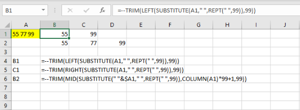 Ví dụ bạn có dãy số “55 77 99” và muốn tách các phần bên trái và bên phải, bạn có thể sử dụng hàm LEFT và RIGHT. Đối với việc chuyển đổi chữ thành số, bạn có thể sử dụng dấu trừ trừ (–, hai dấu trừ). Nếu dữ liệu cần tách là chữ, thì bạn không cần sử dụng hai dấu trừ này. Với hàm MID, bạn có thể ghép một khoảng trắng vào phía trước để dễ dàng tách ra vị trí mong muốn từ trái sang.