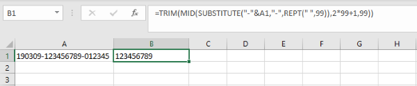 Ví dụ, để lấy cụm chữ “123456789” từ chuỗi “190309-123456789-012345”, bạn có thể ghép một dấu gạch nối vào đầu chuỗi và sau đó sử dụng hàm SUBSTITUTE để tách cụm chữ cần thiết.