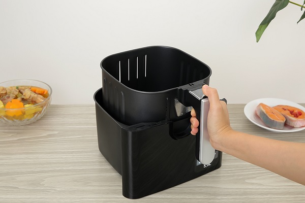 Bước 1: Cho thực phẩm vào khay chiên sau đó nhấn nút Mở/ Tắt để bật nồi chiên không dầu.