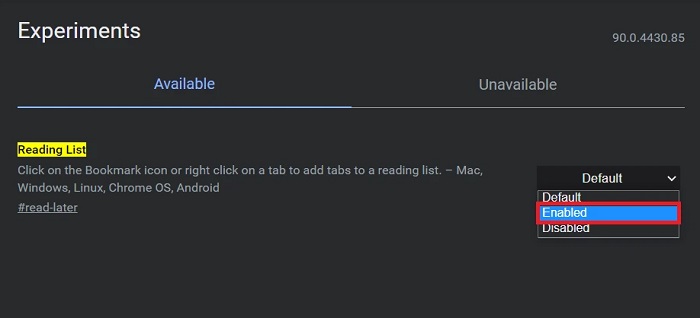 Bước 3: Ngay tại dòng Reading List, bạn hãy nhấn vào mũi tên bên phải -> chọn vào “Enable” để thực hiện cách sử dụng Reading list trên Chrome.