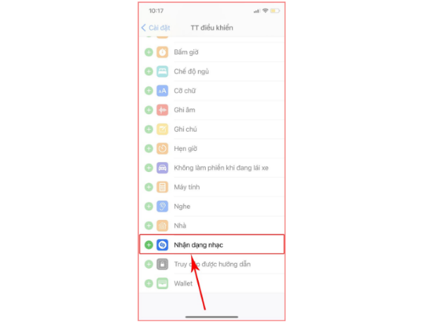 – Tìm mục Nhận dạng nhạc (Shazam) trong danh sách “TT Điều khiển”.