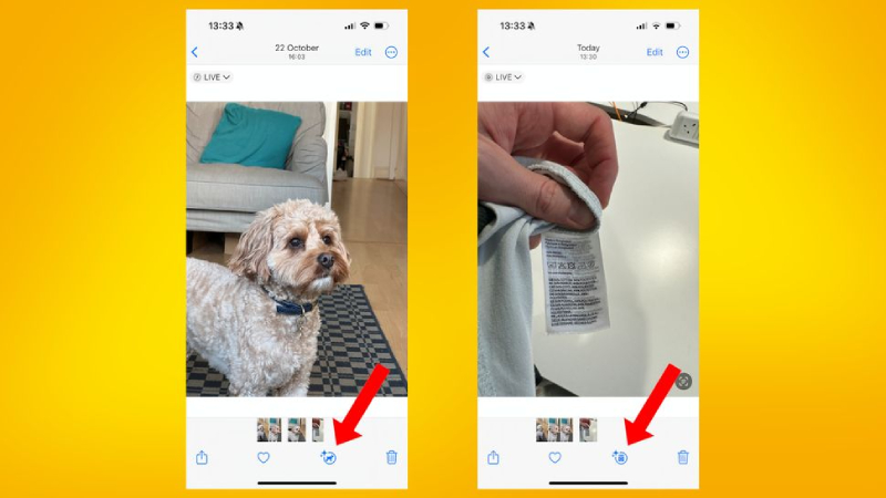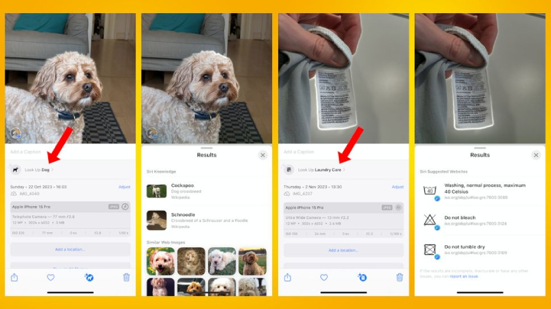 Chạm vào nút Thông tin (Info) được gắn dấu sao, sau đó nhấn vào Tra cứu (Look up) ở đầu phần thông tin ảnh để xem kết quả Tra cứu trực quan. Trong các ví dụ trên, Look Up Dog tiết lộ giống chó của đối tượng bốn chân trong ảnh, trong khi Look Up Laundry Care đưa ra lời giải thích cho từng biểu tượng giặt là được xác định trong ảnh.