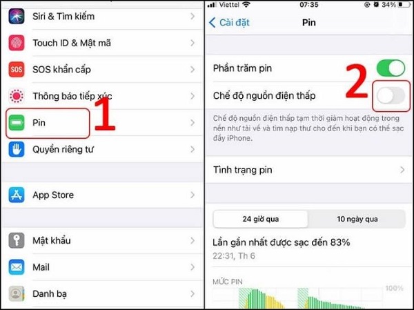 Cách tắt trên điện thoại iPhone như sau: Cài đặt >> Pin >> Chế độ nguồn điện thấp.