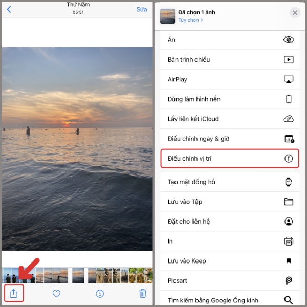 Bước 2: Sau đó bạn nhấn chọn vào nút chia sẻ > kéo xuống và tìm chọn vào mục Điều chỉnh vị trí ảnh chụp.
