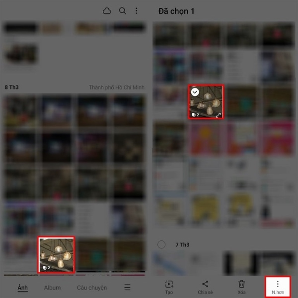 Bước 1: Trước tiên, bạn mở ứng dụng Bộ sưu tập trên điện thoại lên. Sau đó, bạn nhấn giữ để chọn những hình ảnh muốn thay đổi vị trí. Tiếp theo, bạn chọn vào biểu tượng menu 3 chấm Nhiều hơn tại góc dưới bên phải màn hình.