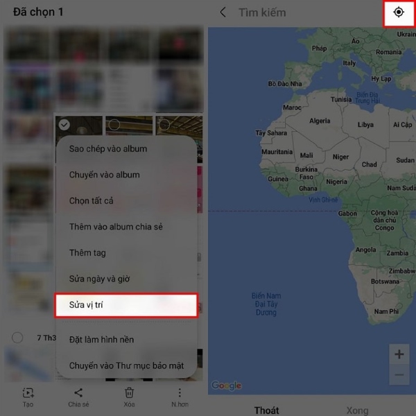 Bước 2: Trên màn hình sẽ hiển thị một loạt các lựa chọn và người dùng có thể thay đổi thông tin vị trí chụp ảnh rồi chọn mục Sửa vị trí. Sau đó, bạn nhấn chọn tiếp vào biểu tượng định vị tại góc trên bên phải màn hình để chuyển bản đồ đến vị trí của bạn để dễ dàng chọn vị trí khác.