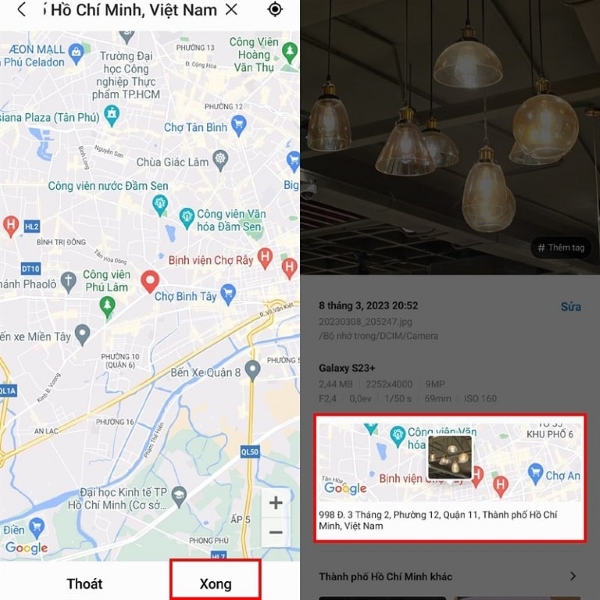 Bước 3: Bạn kéo bản đồ tới khu vực muốn đổi vị trí cho ảnh chụp. Cuối cùng, bạn chỉ cần chọn vào bản đồ tới nơi muốn dùng thông tin địa điểm mới này để đổi vị trí mới cho ảnh chụp rồi nhấn vào Xong để hoàn thành. Bạn đợi trong giây lát để điện thoại hoàn tất chuyển đổi thời gian là được.